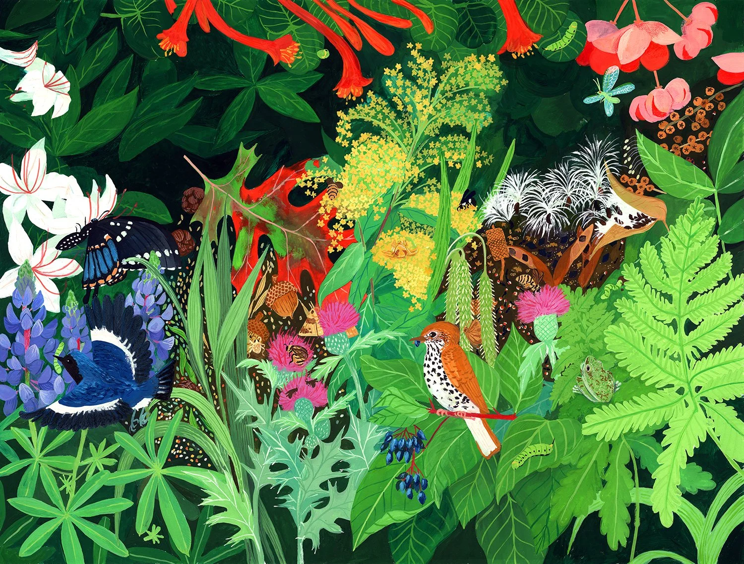 Julian Plum (he/they) is a queer, transmasculine picture book author and illustrator living in Newfield. Working primarily in gouache, his work blends bright colors and warm, tactile brushstrokes. Mostly, Julian's work celebrates our neighbors: the frogs, mice, wood sorrel and mushrooms in our backyards and woods. When he isn't painting, Julian can be found mostly in his garden, negotiating with chipmunks about blueberries.