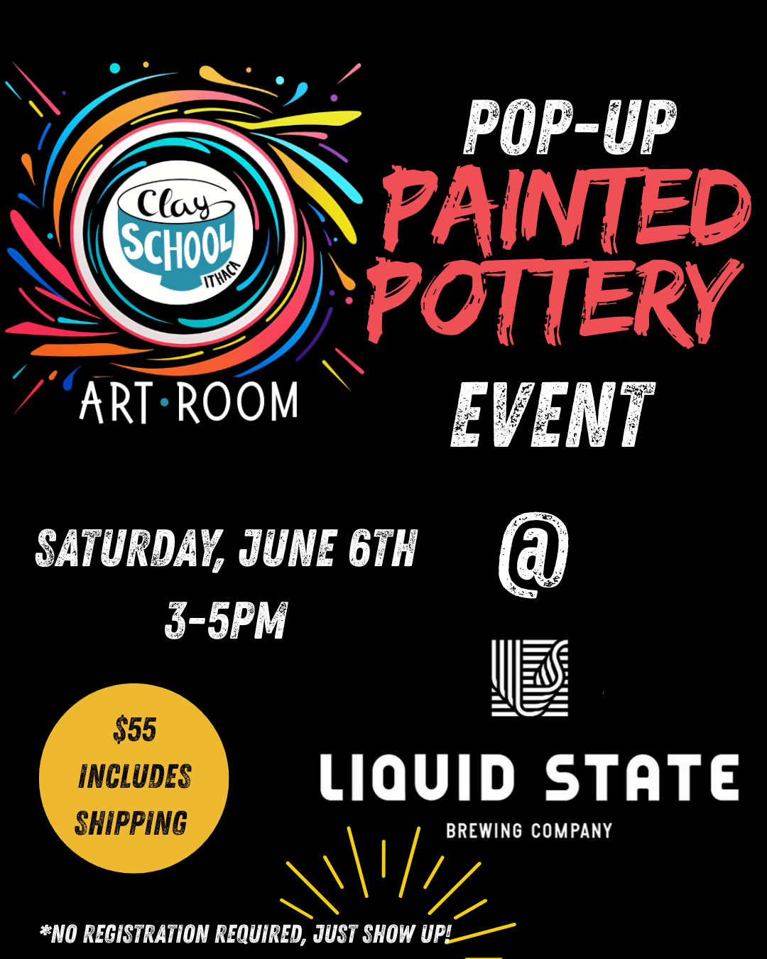Pop-Up Painted Pottery Event Saturday, June 6, 2026 3:00 PM 5:00 PM Liquid State Brewing Co 620 West Green Street Ithaca, NY, 14850 United States (map) Google Calendar ICS